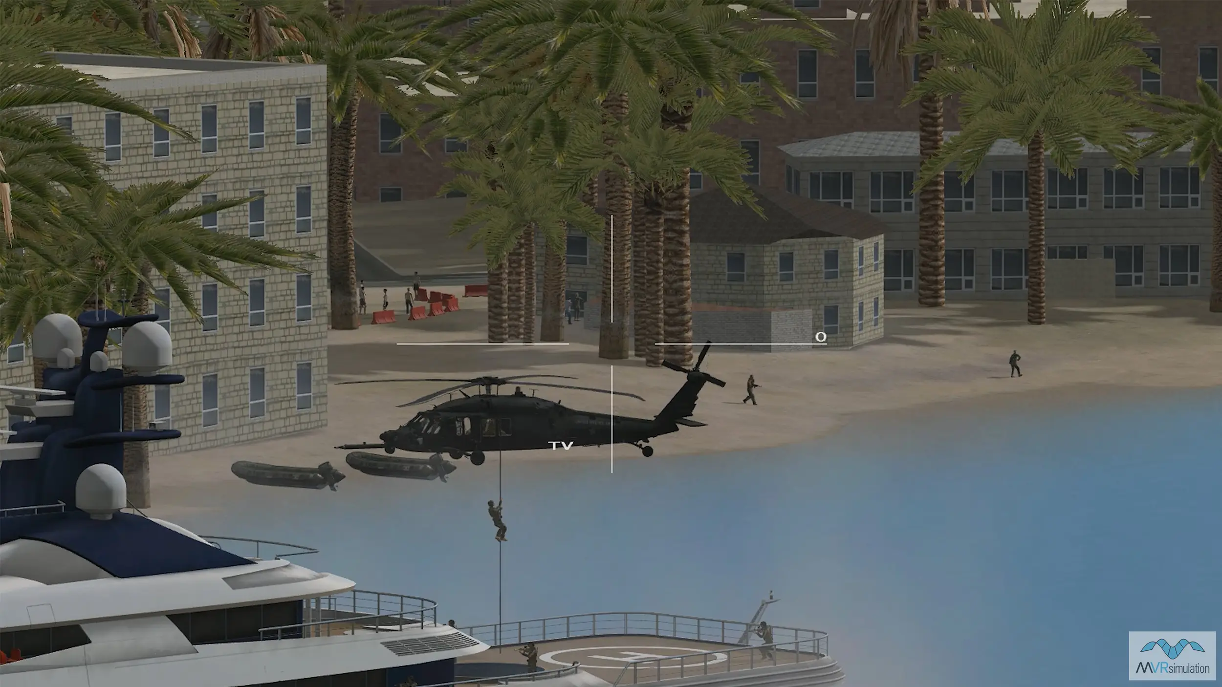 Above: A VRSG real-time 3D MH-60 Black Hawk helicopter model with switch state animation showing personnel fast-roping onto the deck of a yacht in a virtual Tampa Bay. (Image: MVRsimulation)