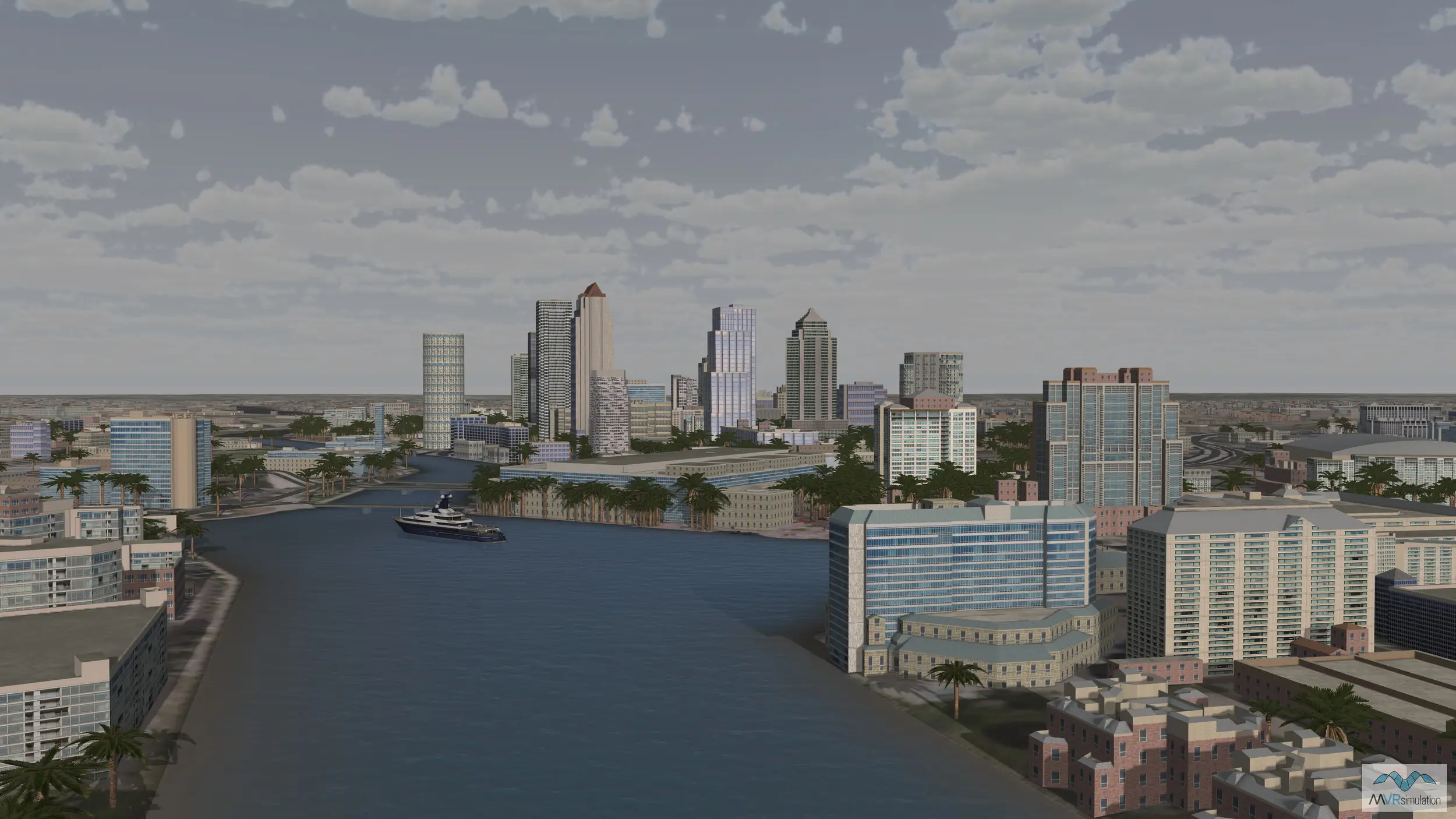 Integrated road vectors from OpenStreetMap were used to depict the highway infrastructure around downtown Tampa, and more than 4,000 tree models were distributed throughout the area for added realism. As the Tampa Bay shoreline was a key part of the simulated demonstration, bathymetric data at a three-metre resolution was incorporated from National Oceanic & Atmospheric Administration (NOAA) sources to create the underlying shore elevation.