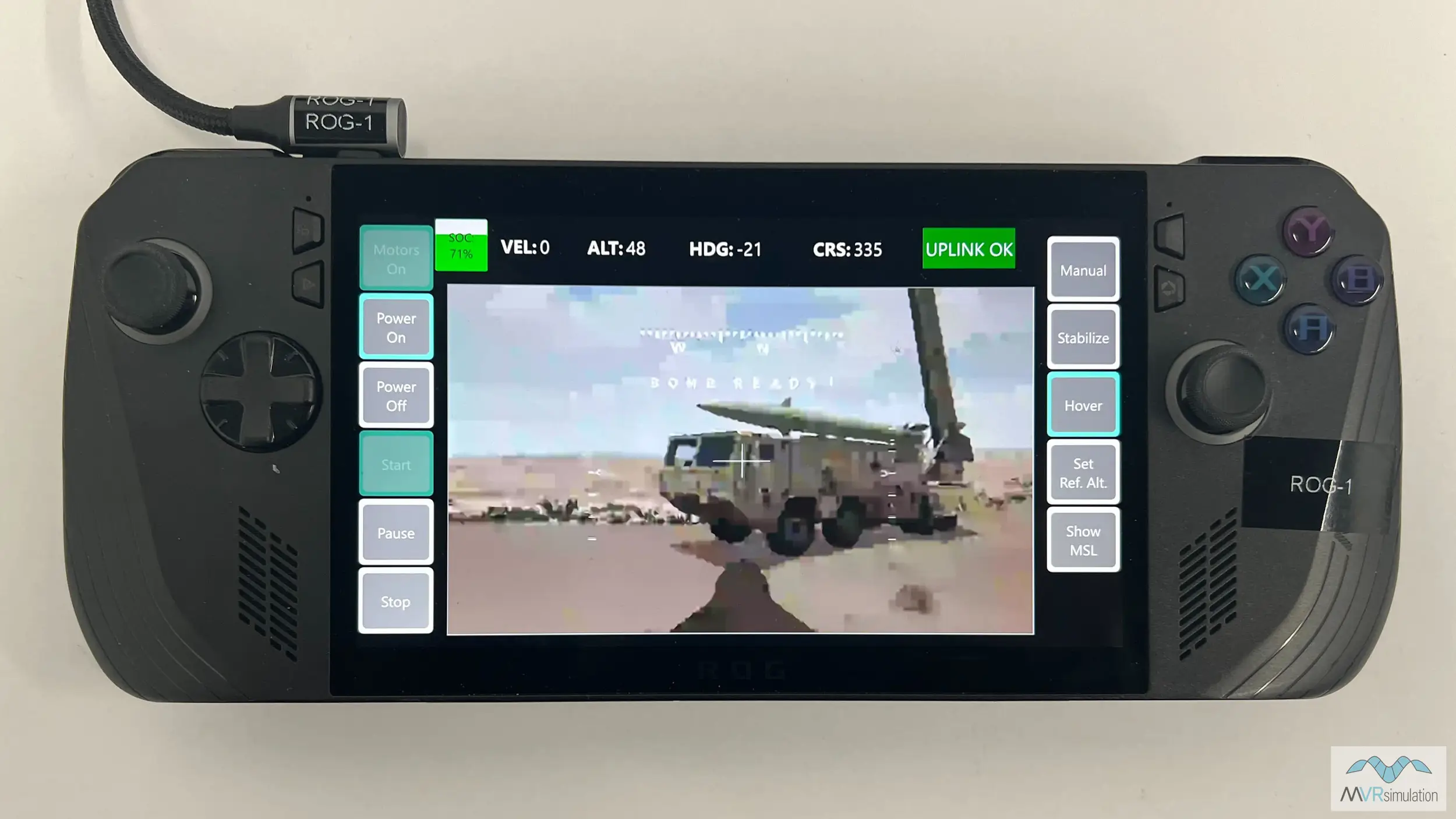 The highly-portable (back-pack carry-on or pelican case) system consists of a high-end gaming notebook running VRSG and a Republic of Gamers (ROG) handheld controller device providing 1080p resolution with configurable integrated pilot controls. VRSG simulates the front-facing camera view of the UAV, streaming the operator's FPV to the handheld device. The stream shows the UAV’s rotor blades and munition nose-cone so the user gets a realistic view of the scenario. The simulator is also supplied with 2D video display goggles, allowing the UAV operator the option to experience the FPV stream as a head-mounted (non-tracking) view.