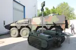 In addition to the UAS the Boxer reconnaissance variant could be used in conjunction with Milrem Robotics' THeMIS UGV which features a hybrid drive system and was shown fitted with a Thales mast-mounted Ground Observer 12 surveillance radar.